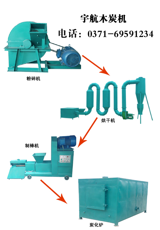 木炭機(jī)設(shè)備是把原料竹木鋸末、花生殼、玉米棒、甘蔗渣、棉花稈、玉米稈、稻谷殼、雜樹(shù)枝等經(jīng)木屑粉碎機(jī)粉碎成10mm之內(nèi)的顆粒狀,經(jīng)烘干機(jī)烘干使之含水份含量在12%以內(nèi),入制棒機(jī)經(jīng)高溫,高壓使之成型(不加任何添加劑)后放入炭化爐(自建土窯)進(jìn)行炭化,即成成品木炭.該木炭機(jī)生產(chǎn)的木炭密度大、體積小、可燃性好,可替代薪柴及燃煤.一般產(chǎn)品外徑為 50-60mm ,孔徑為 15-20mm ,呈空心四角或六角柱形.該產(chǎn)品尤其適用于北方地區(qū)秋冬燒炕取暖、大棚升溫或作普通生活燃料.木炭機(jī)全套設(shè)備包括制棒機(jī)、炭化爐、烘干機(jī)等設(shè)備組成。