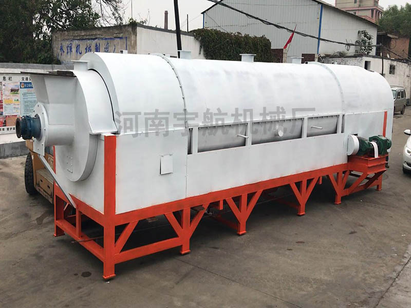 3.炭化主機達到設(shè)定溫度后開始上料,首先進入預熱區(qū)把原料剩余水分烘干,之后進入炭化區(qū)炭化,炭化溫度控制在600℃左右,炭化過程中所產(chǎn)生的煙氣返回凈化系統(tǒng),凈化之后轉(zhuǎn)化為可燃氣循環(huán)燃燒,這樣利用自體產(chǎn)生的煙氣燃燒自體,滿足炭化機炭化時所需熱能連續(xù)生產(chǎn),達到環(huán)保節(jié)能的效果;